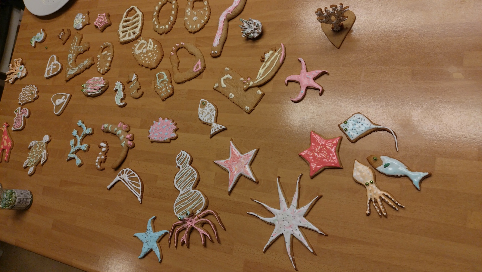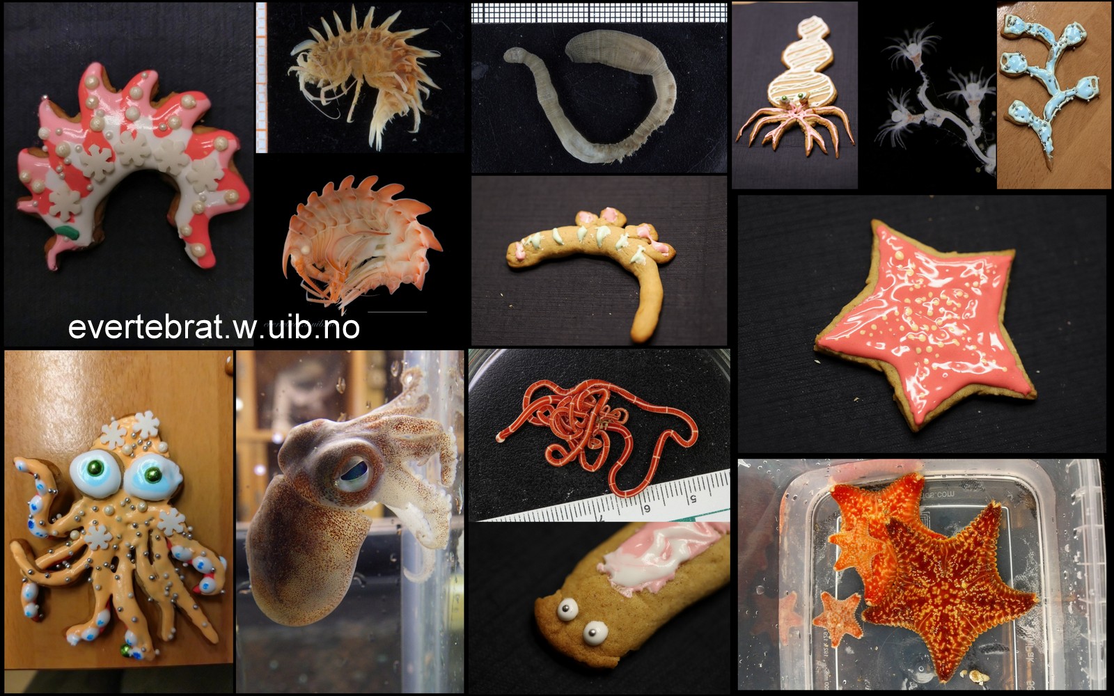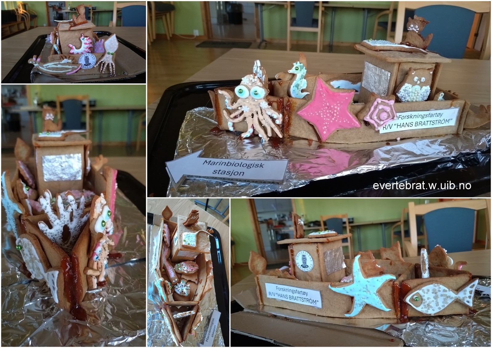 R/V “Hans Brattstrøm” Foto: Katrine KongshavnR/V “Hans Brattstrøm” i pepperkakeversjon – fylt til randen (og vel så det!) med marin biodiversitet – og en skipskatt! Foto: Katrine KongshavnUiB-uglen måtte naturligvis også med – den ser muligens litt eksamensstresset ut? Unik bruk av en masteroppgave? Maria gikk vitenskapelig til verks med sin Hornera. Foto: K. KongshavnAdventspost om Hornera på InstagramAdventspost #1 om Membranmosdyr og nakensneglene som liker å spise på dem Biologisk diversitet i denne pepperkakekreasjonen; vi dekket over ganske mange dyrerekker! her er tanglopper, børstemark, eremittkreps, polyppdyr, blekksprut, slimorm og sjøstjerner. Bilder: Katrine Kongshavn, minus den levende hydroiden som er fra Luis Martell.Pepperkakebåten i pepperkakebyen – den er i godt selskap der! Foto: K. Kongshavn“Team Bryozoa”: Deltagerne på workshopen – og bakemestere! Foto: Tomas Sørlie