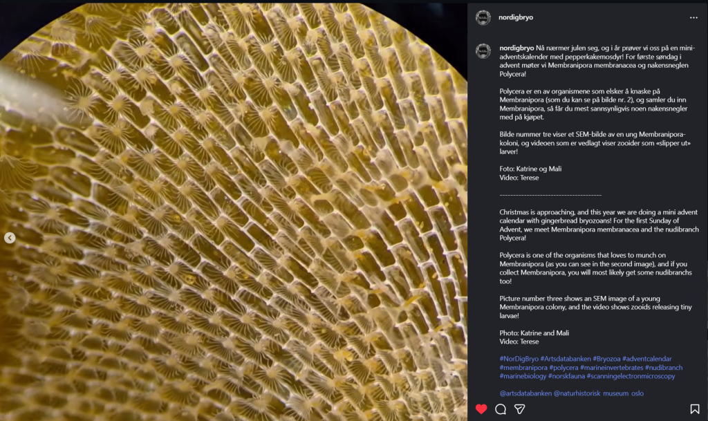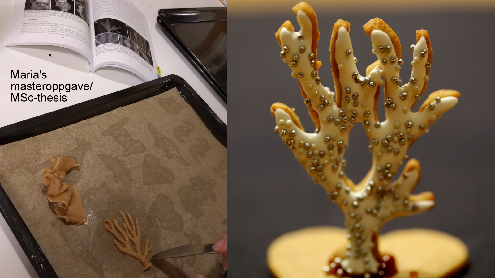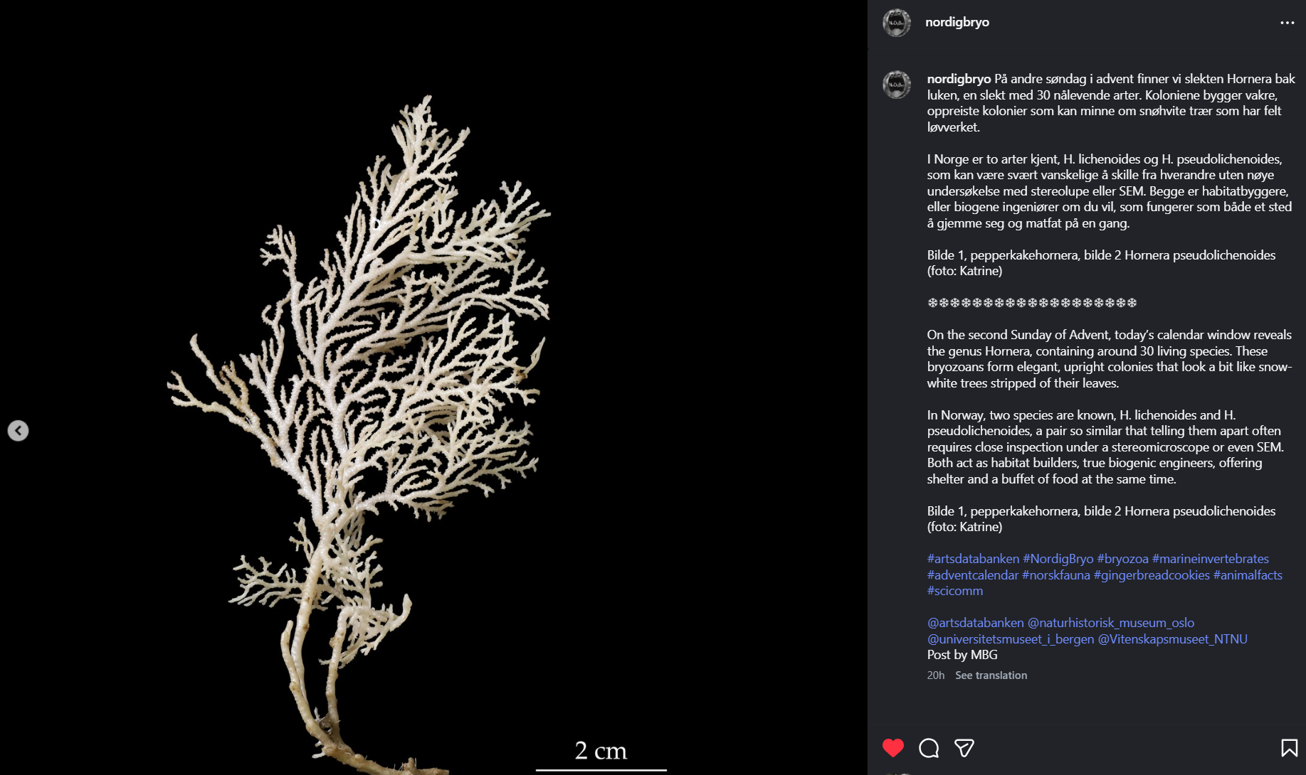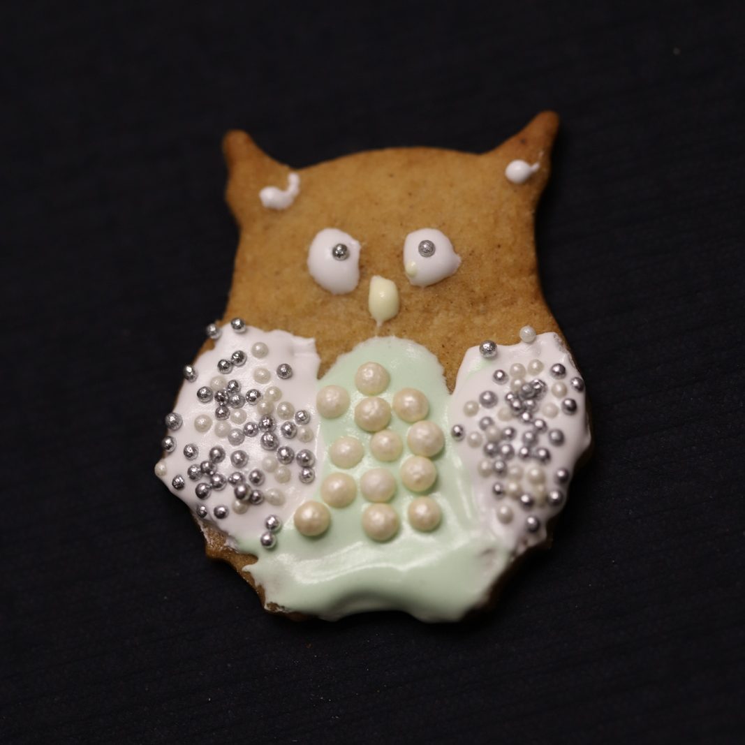 R/V “Hans Brattstrøm” Foto: Katrine KongshavnR/V “Hans Brattstrøm” i pepperkakeversjon – fylt til randen (og vel så det!) med marin biodiversitet – og en skipskatt! Foto: Katrine KongshavnUiB-uglen måtte naturligvis også med – den ser muligens litt eksamensstresset ut? Unik bruk av en masteroppgave? Maria gikk vitenskapelig til verks med sin Hornera. Foto: K. KongshavnAdventspost om Hornera på InstagramAdventspost #1 om Membranmosdyr og nakensneglene som liker å spise på dem Biologisk diversitet i denne pepperkakekreasjonen; vi dekket over ganske mange dyrerekker! her er tanglopper, børstemark, eremittkreps, polyppdyr, blekksprut, slimorm og sjøstjerner. Bilder: Katrine Kongshavn, minus den levende hydroiden som er fra Luis Martell.Pepperkakebåten i pepperkakebyen – den er i godt selskap der! Foto: K. Kongshavn“Team Bryozoa”: Deltagerne på workshopen – og bakemestere! Foto: Tomas Sørlie